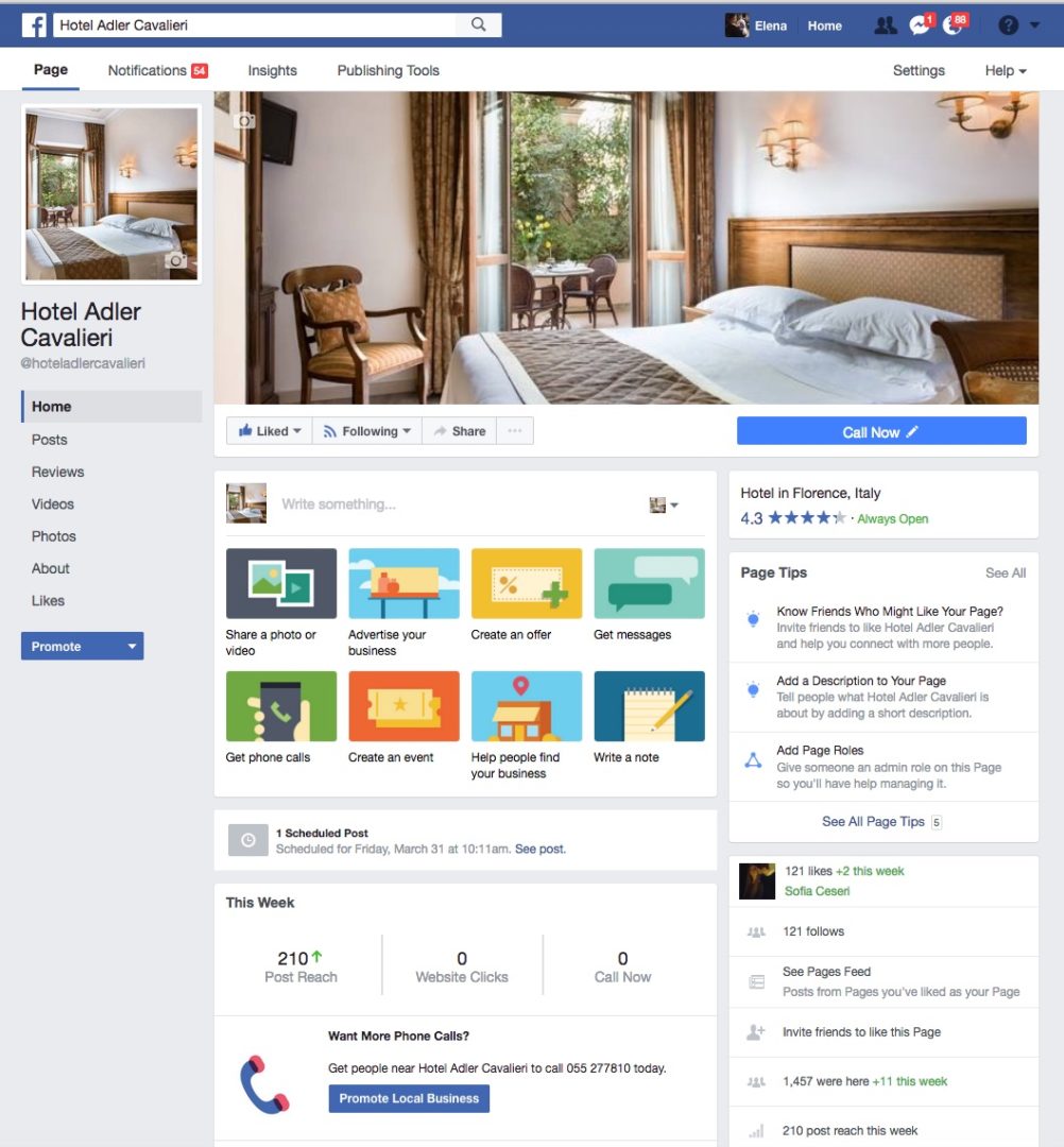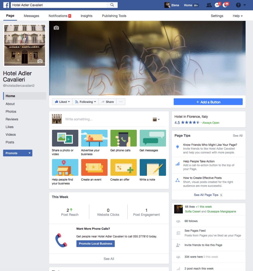 Mi è capitato di rifare questo processo di recente e voglio raccontare come funziona, magari è utile a qualcuno. Nel mio caso si trattava di un hotel di Firenze. Che aveva due pagine: una con 68 likes e 12 recensioni, l’altra con 121 likes e 46 recensioni.